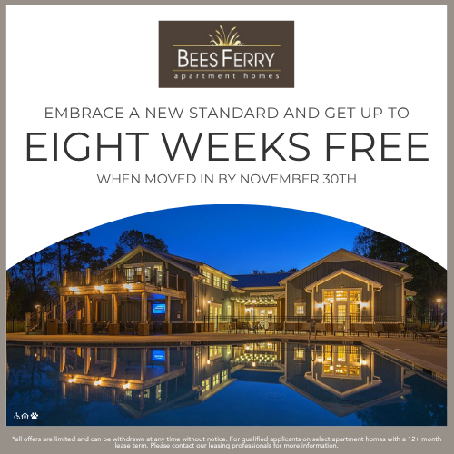 Take advantage of up to eight weeks free on select apartments at Bees Ferry when moved in by November 30th!